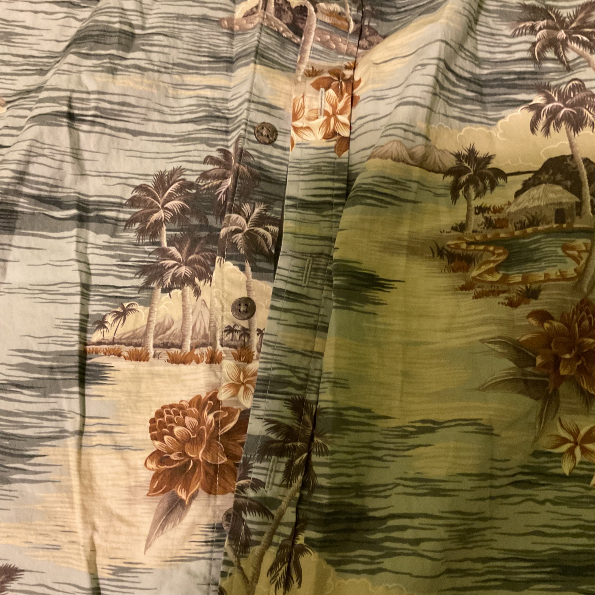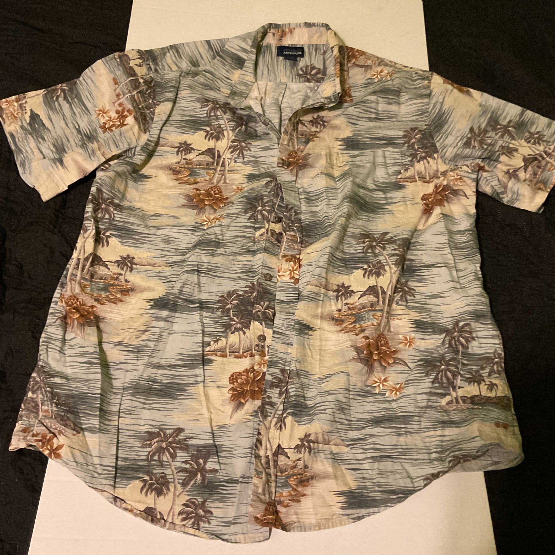 Classic tropical Hawaiian shirt featuring palm trees, floral prints, and island scenes. 100% cotton, short sleeve, button-up. Size XLT. Great for summer or casual wear.