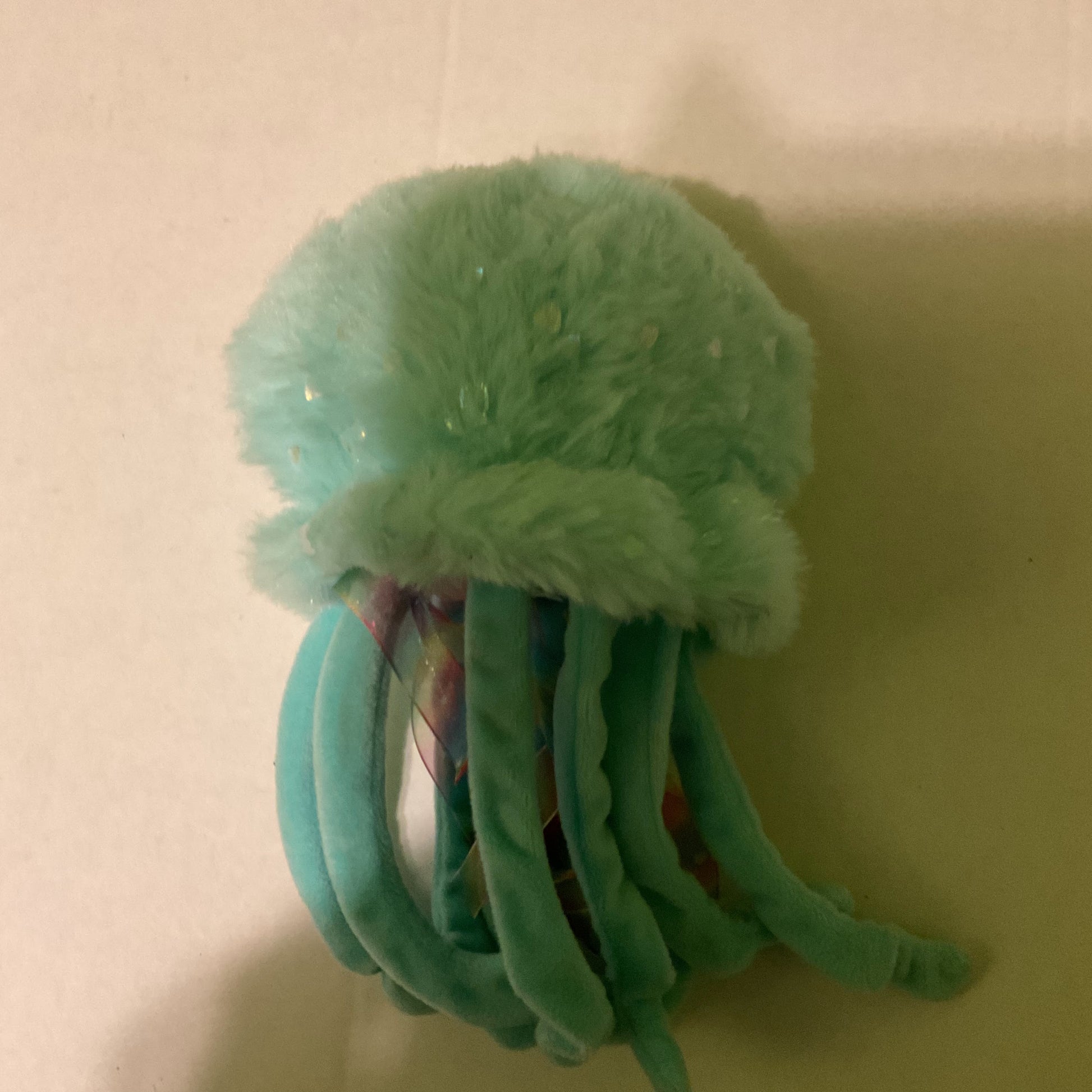 This adorable aqua plush jellyfish toy features soft polyester material, rainbow ribbon tentacles, and a super-cute face design. Open-box condition with no damage — looks and feels new. Great for kids, collectors, or anyone who loves ocean-themed plushies. Surface washable and recommended for ages 3+.