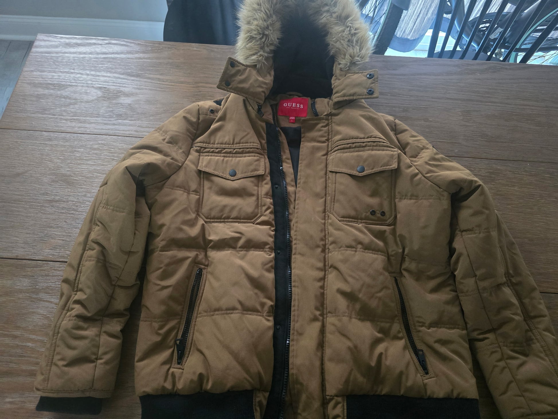 GUESS Men’s Brown Hooded Puffer Jacket with Faux Fur Trim – Size L
