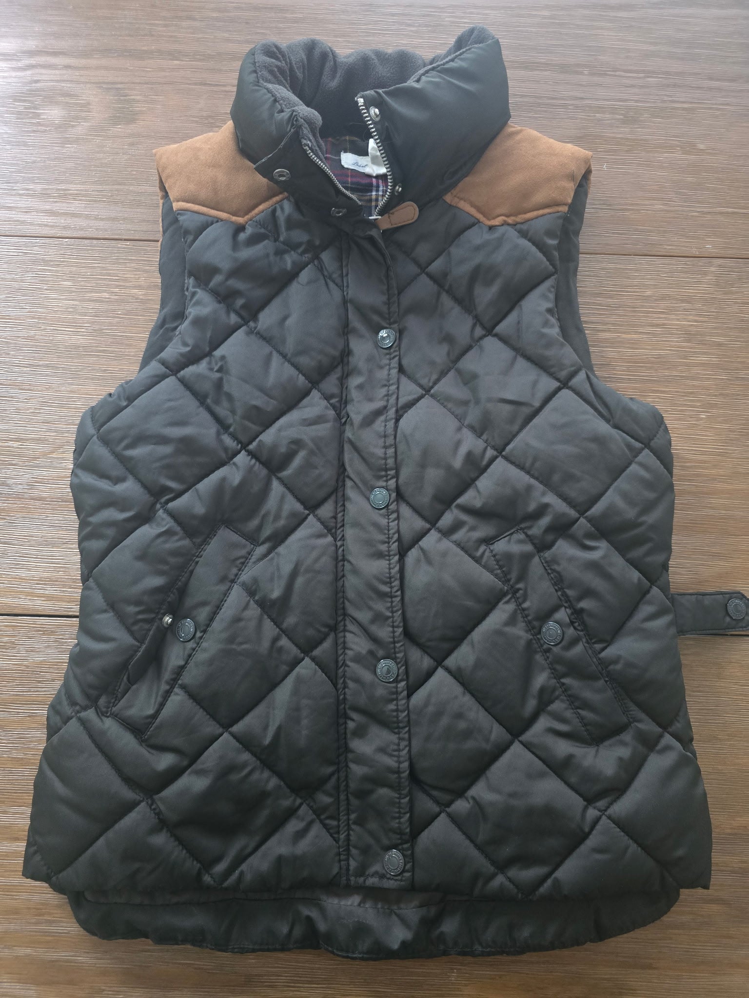 Pre-owned H&M L.O.G.G. women’s quilted puffer vest in black with brown faux-suede shoulder trim. Plaid inner lining, snap-front closure with zip, and adjustable side tabs for a custom fit.