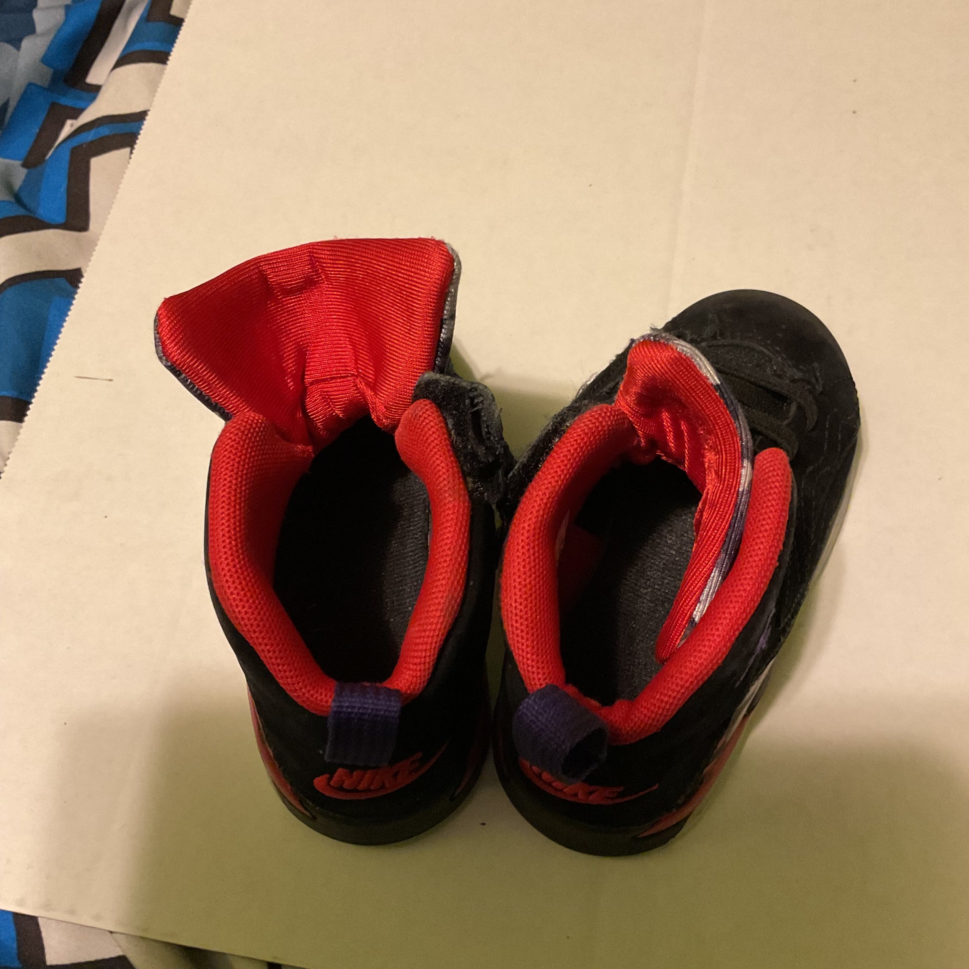 Pre-owned toddler Nike Air Jordan 8 Retro shoes in black/red/purple colorway. Size 7C. Signs of wear but still in good condition. See photos for details.