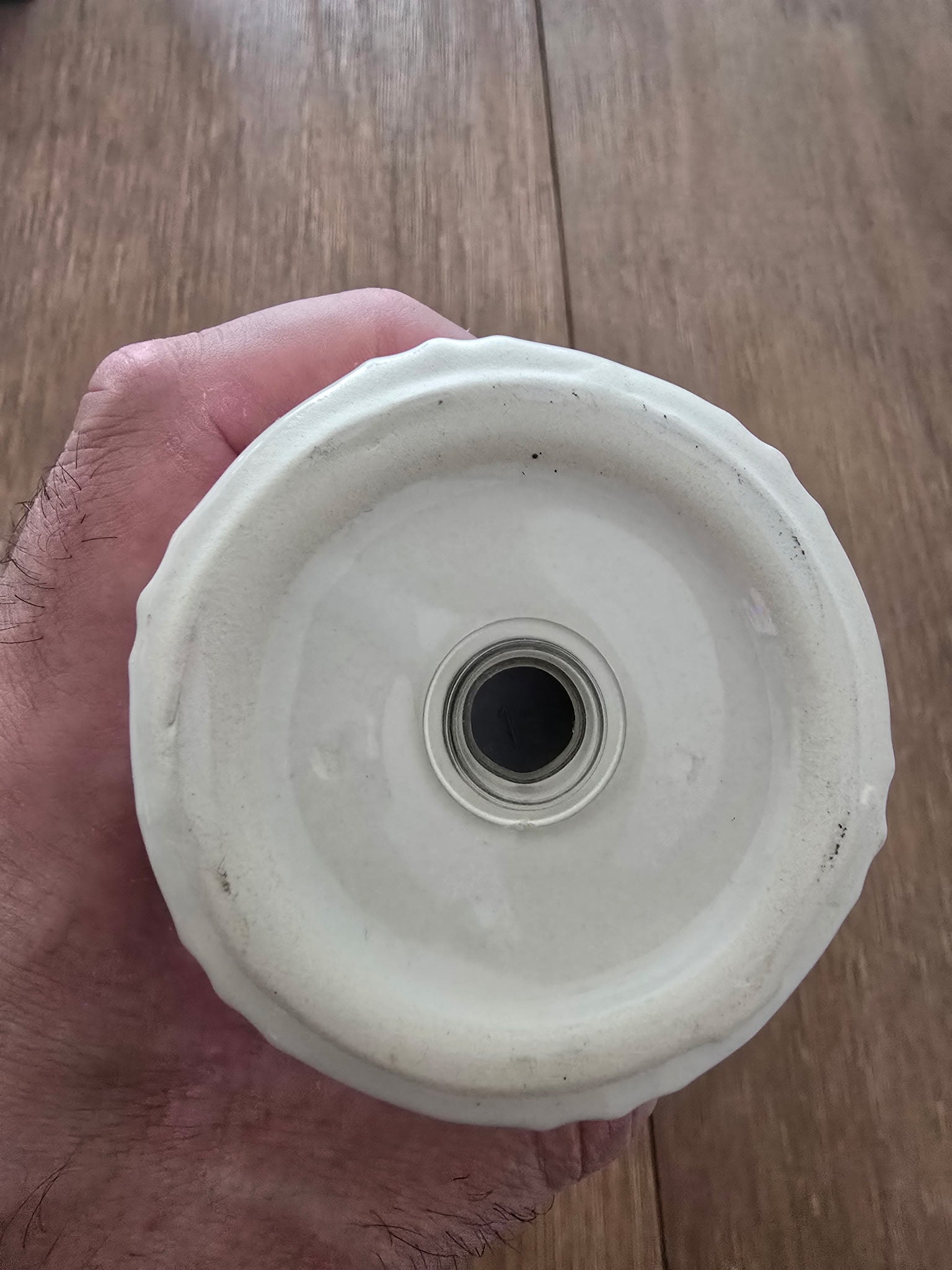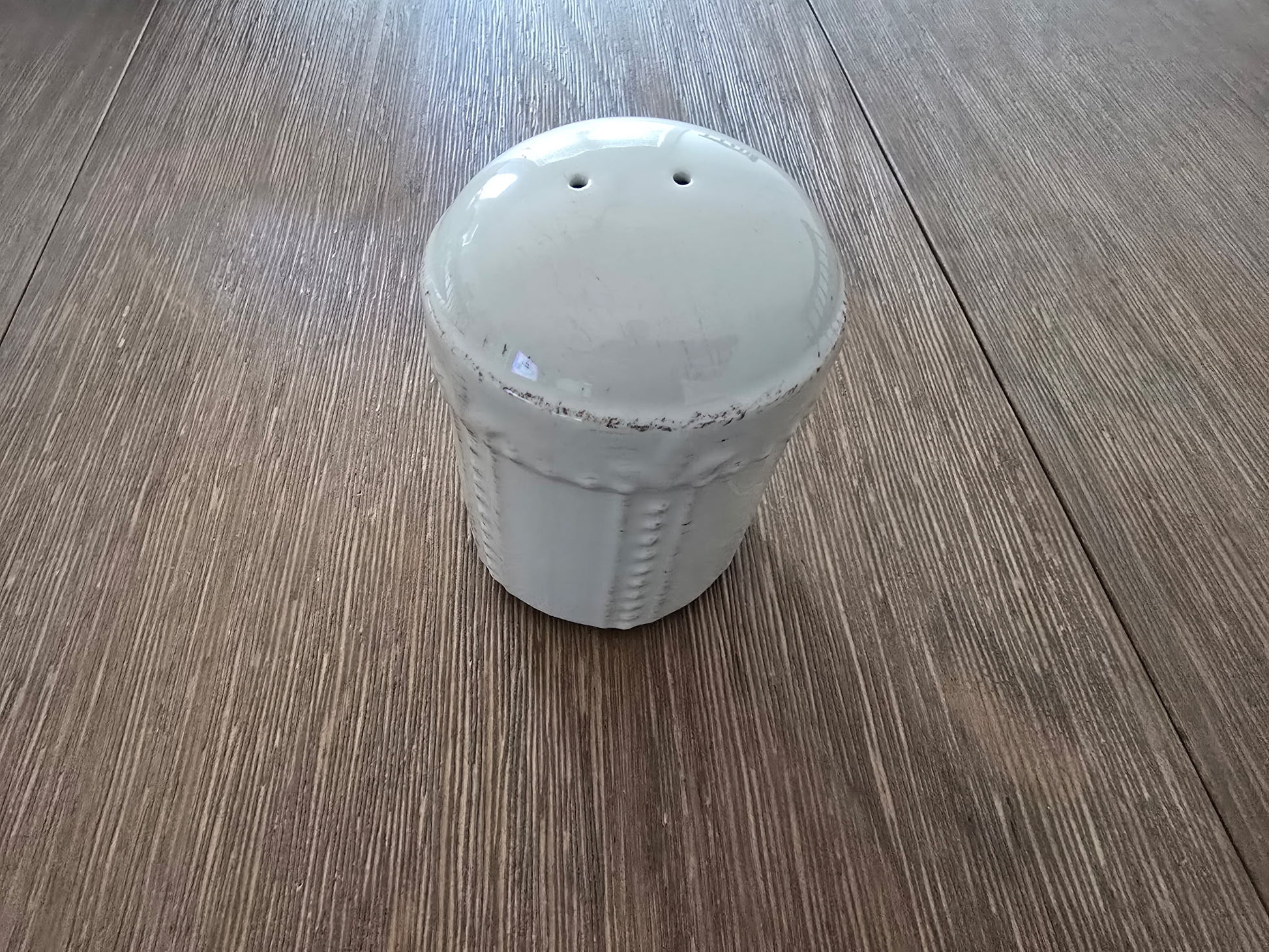 Pre-owned ceramic salt & pepper shakers. White distressed finish, farmhouse style. Minor wear consistent with age and use.