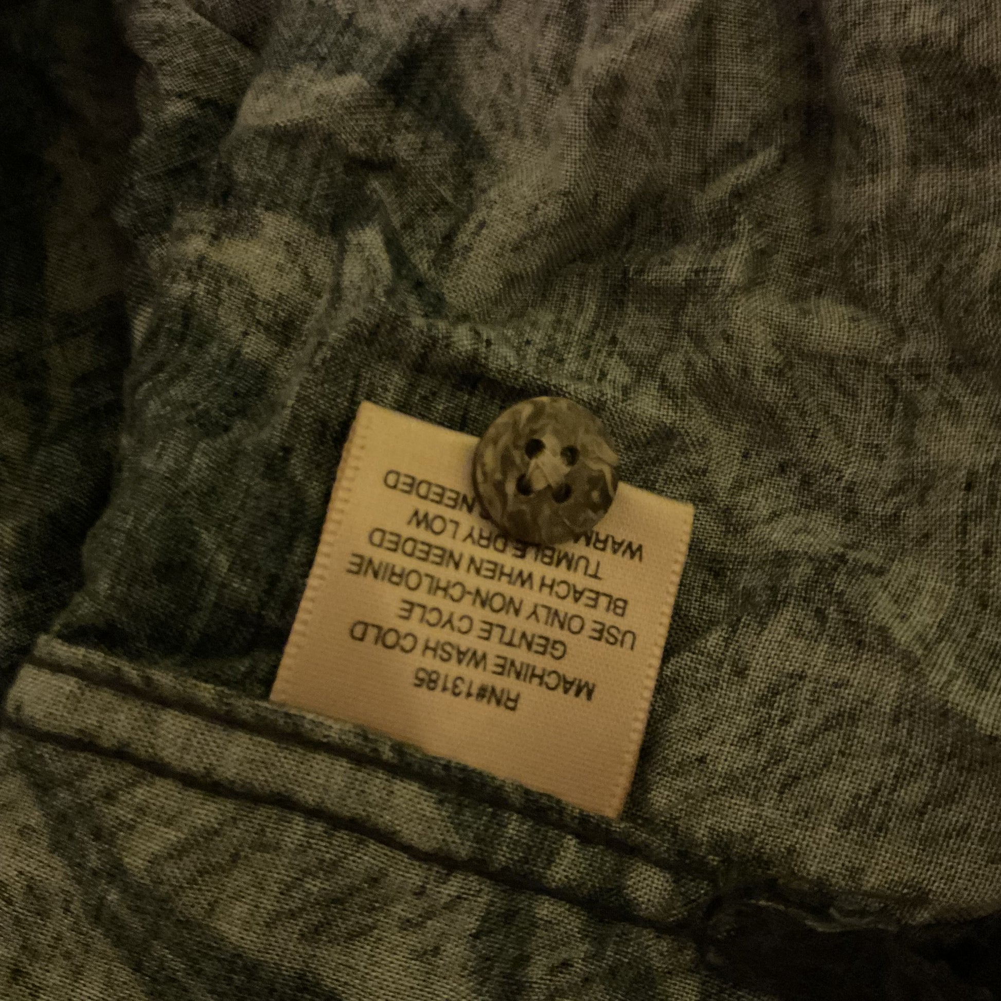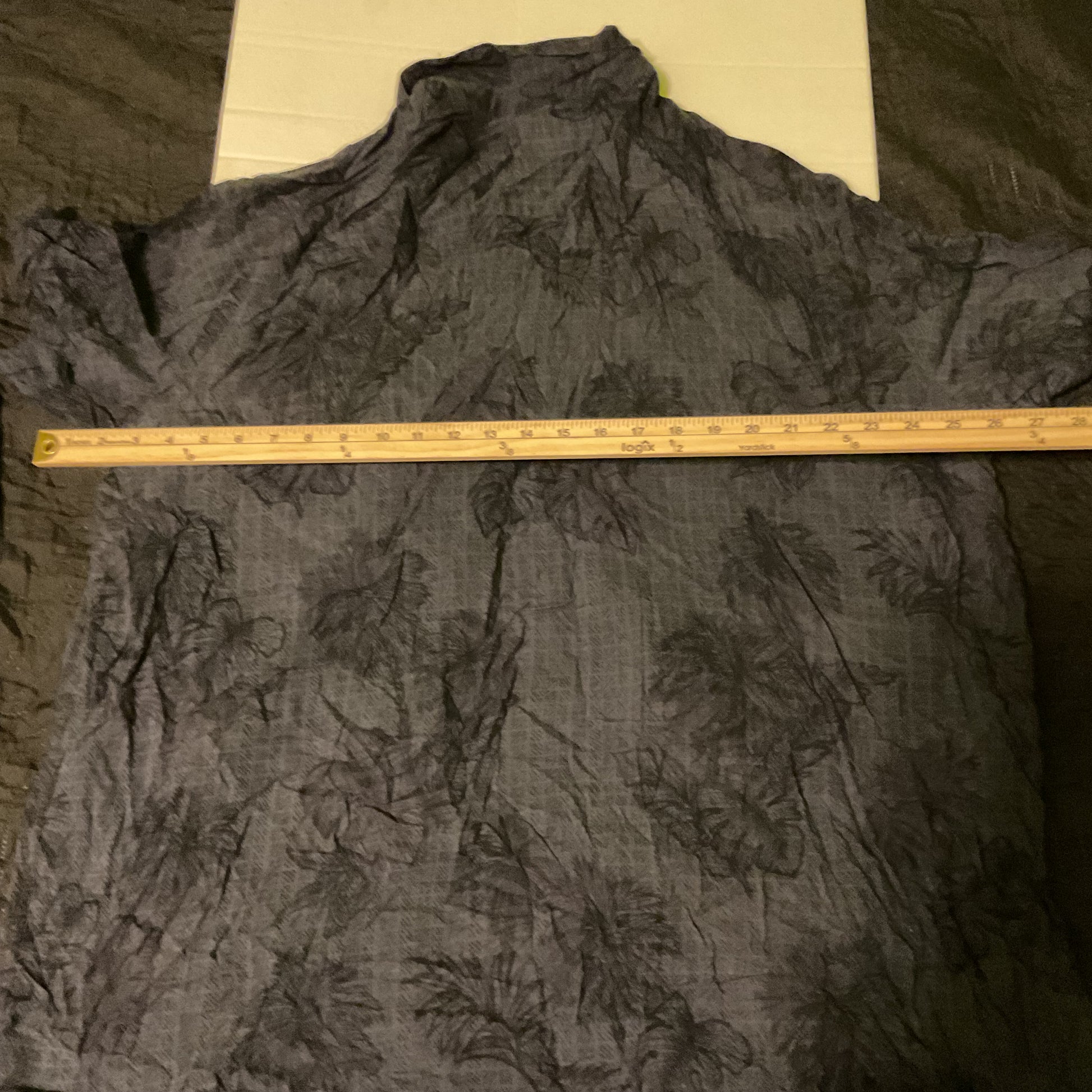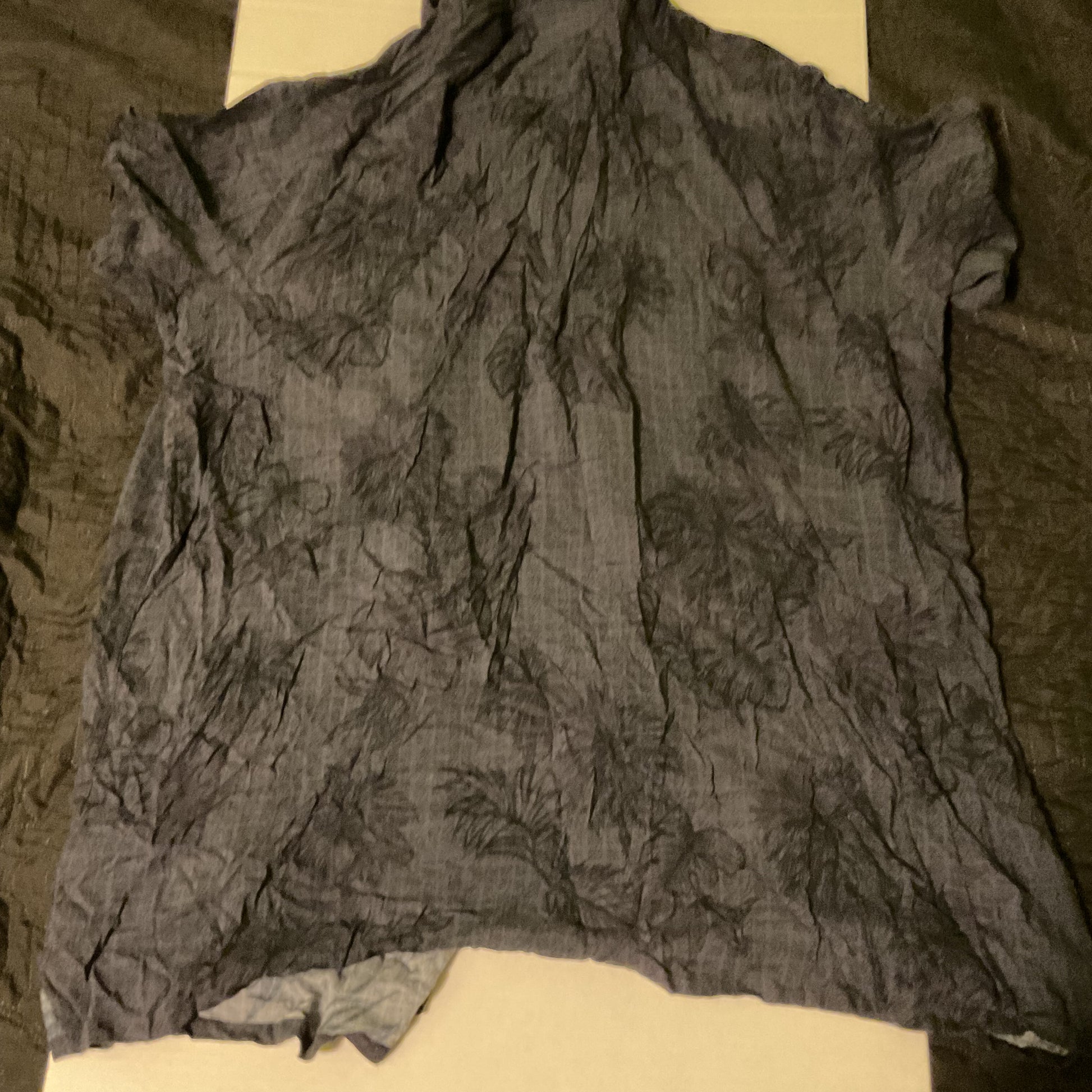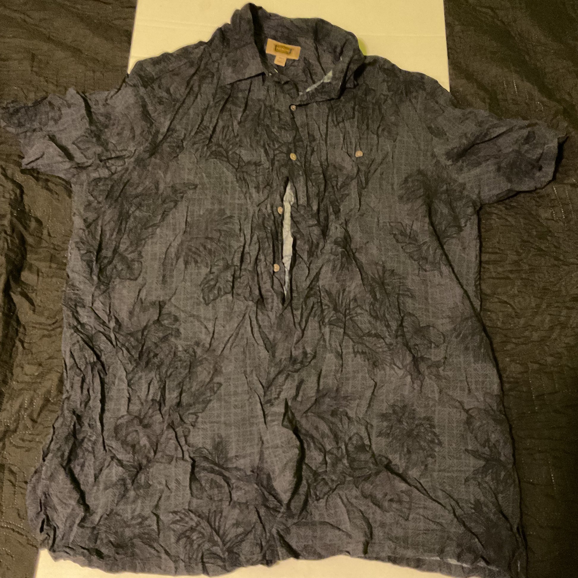 The Foundry Supply Co. short sleeve camp shirt in dark charcoal palm print. Men’s 2XLT. 100% rayon. Flaw: small split at a side seam (shown). Sold as-is; still wearable. Does not go all the way thru